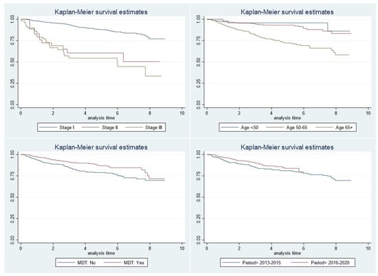 The descriptive statistics were calculated for age at diagnosis (classified into three age groups: <50, 50–65, and over 65 years), period of diagnosis (two groups: 2013–2015 and 2016–2020), method of diagnosis (histological or clinical/instrumental), stage, therapies, district, and recurrence (excluded stage IV) stratified by group status (MDT vs. non-MDT) and period of diagnosis. We decided to eliminate stage IV from the recurrence calculation to emphasize the appearance of any loco-regional recurrences or distant metastases. A multivariable Cox proportional hazard regression model was constructed to investigate the association between stage, age, therapies, MDT, recurrence, and overall and disease-free survival (time was expressed in years). The time-to-event outcome, i.e., disease-free survival (DFS) and overall survival (OS) by stage, age, MDT, and period, were calculated using the Kaplan–Meier method. Analyses were performed using STATA 16.1 software (16.1, StataCorp LLC, College Station, TX, USA). In this study, we reported 95% confidence intervals (CI).
