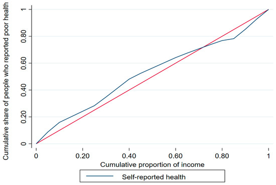 The concentration curves for income and education are shown in Figure 1 and Figure 2, respectively. The income-based concentration curve for poor health status (blue) almost overlaps with the line of equality (red), suggesting no inequality, whereas the education-based concentration curve is above the line of equality, confirming the prevalence of poor health status among the less educated older adults in the KSA.