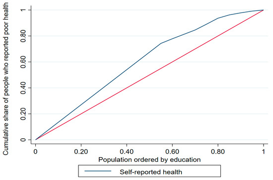 The concentration index (ranging from −1 to +1) is calculated as twice the area between the concentration curve and the line of equality [30], whereby a positive index value indicates that a given health variable is disproportionately concentrated among the rich/highly educated and a negative index value indicates concentration among the poor/less educated. The concentration curve offers a visual representation of the degree of inequality in SRH by plotting the cumulative percentage of a health variable with respect to the cumulative share of that variable in the population (variables are ranked according to a socio-economic status indicator from the lowest to the highest) [30]. For example, with respect to income and education level, a curve above the line of equality (i.e., the 45-degree line) indicates that poor health status is concentrated among those with lower income/less education, whereas a concentration curve below the line of equality indicates that poor health status is concentrated among those with higher income/higher education. The further the concentration curve diverges from the line of equality, the greater the degree of inequality.