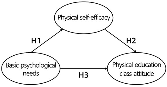 Finally, the relationship between physical self-efficacy and attitudes toward PE has been studied in terms of the behavioral intention, effort, and continuity of students’ PE participation in PE situations. These studies demonstrated a significant effect between the two variables [25,26,27,28]. Students’ beliefs of being able to perform a given task in PE can determine their lifelong attitudes toward PE [29,30]. This is because a positive experience is an important factor that affects attitudes [31]. Furthermore, various studies reveal that variables such as self-efficacy are important in that positive results drive students to be more interested in PE [32,33,34,35]. These results were more prominent in adolescents than in adults [36]. Ultimately, there is a profound relationship between the three variables: basic psychological needs, physical self-efficacy, and attitudes toward PE. Therefore, the third research hypothesis (H3) is as follows: