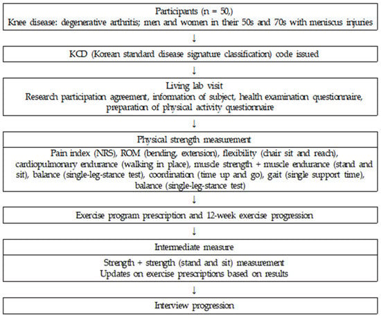 To comprehensively analyze participants’ experiences in the exercise rehabilitation program, an understanding of the living lab’s operational process is essential. The living lab’s operational process involved recruiting male and female individuals aged 50–70 years who experienced discomfort in daily life due to knee conditions (degenerative joint arthritis and meniscus damage). The recruited participants received the Korean standard classification of disease and causes of death (KCD) code based on a specialist’s diagnosis. Upon visiting the living lab, they completed a research participation consent form, provided personal information, and filled out health screening questionnaires (health screening) as well as readiness for physical activity surveys. This study was approved by the institutional review board of Gachon University (No. 2023-018, 22 March 2023). Before starting the exercise program, ERFC assessment elements, including pain index, joint range of motion, flexibility, cardiovascular endurance, muscle strength, muscle endurance, balance, coordination, gait, and balance, were evaluated. The measured assessments were entered into the “ICT-based exercise rehabilitation service platform” to enable the instructor to prescribe exercise programs tailored to individual characteristics. Participants participated in a prescribed exercise program for 12 weeks. Additionally, to systematically manage exercise during its progression, interim measurements (balance, muscle strength, and muscle endurance) were conducted at two-week intervals. Based on the interim measurement results, the form, intensity, and frequency of exercise were adjusted and exercise was prescribed accordingly. Furthermore, to ensure systematic management, the “ICT-based exercise rehabilitation service platform”, implemented with ICT, was utilized to manage and monitor community patients. The operational process of the living lab is shown in Figure 1.