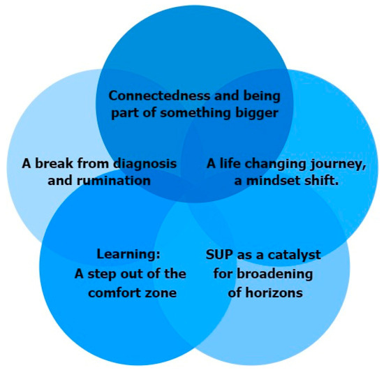 Five main themes were identified from the data: (1) SUP as a catalyst for the broadening of horizons; (2) learning: a step out of the comfort zone; (3) a break from diagnosis and rumination; (4) connectedness and being part of something bigger; (4a) connectedness to nature, specifically blue nature; (4b) connectedness to the group of peers; (5) a life changing journey; a mindset shift.