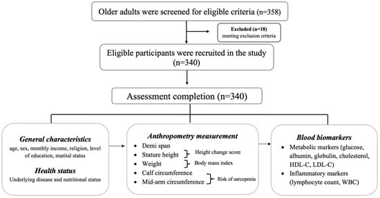 This cross-sectional study was conducted at Songklanagarind Hospital, Thailand. Participants included 340 older adults (205 females and 135 males) (age mean ± SD: 66.2 ± 4.1 years) and participants were recruited from 15 February 2021 to 31 July 2021 through purposive sampling from the general practitioner (GP) and Primary Care Unit (PCU). Eligible participants were over 60 years of age who visited the GP and PCU clinics for follow-up of non-communicable diseases (diabetes, dyslipidemia, hypertension, obstructive pulmonary disease, gout, and coronary artery disease). Exclusion criteria included physical impairment that could hinder anthropometry assessment (disabilities, limb amputation, bone deformity, scoliosis, and thoracic hyperkyphotic), history of fracture (leg bones, arm bones, or spine) as well as emergent infectious status that could affect hematological characteristics. The flow of participants is shown in Figure 1.