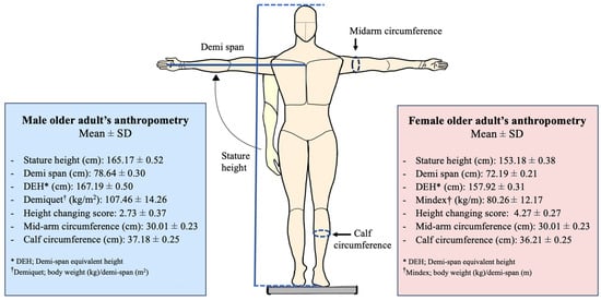 Anthropometry measurements (including: stature height, demi-span, demi-span estimated height, Demiquet, Mindex, HCSs, mid-arm circumference, and calf circumference) in older male and female adults (n = 340).