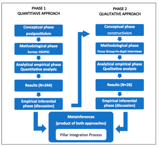 The study’s design followed a sequential explanatory mixed-methods model. This design consists of a first phase in which quantitative data was collected and analysed to determine the nursing staff’s perception of the institutional PSC, followed by another phase in which qualitative data was collected and evaluated by delving into the nurses’ perceptions of PS and the factors that, according to the nurses, contextualise and influence PSC. Finally, the results obtained in both phases were integrated into the interpretation and elaboration of the study report to answer the final objective of the study, allowing for a more exhaustive discussion of the results [21,22]. In this final phase, the results of the two previous phases were integrated and interpreted to explain the factors contextualising and influencing nurses’ PSC by performing a Pillar Integration Process (PIP) [23]. Figure 1 summarises the study’s design, with the approach, sampling, and data collection and analysis methods used in each phase (Figure 1).