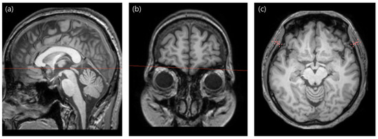 TMT measurements were meticulously conducted on both the right and left sides by a highly qualified and board-certified radiologist (H. J. L., with 9 years of subspecialty experience in neuroradiology). The acquired images underwent meticulous reformatting, aligning with an axial plane parallel to the anterior commissure–posterior commissure line to guarantee optimal visualization and precision in the anatomical assessment. TMT was then measured perpendicular to the long axis of the temporal muscle using the orbital roof and Sylvian fissure as landmarks. Image reformatting and measurements were performed using 3D Slicer (version 5.4.0, https://www.slicer.org (accessed on 2 January 2024)) [23,24]. The measurements for each side were averaged and used for further analysis. Figure 1 illustrates the TMT measurement procedure.