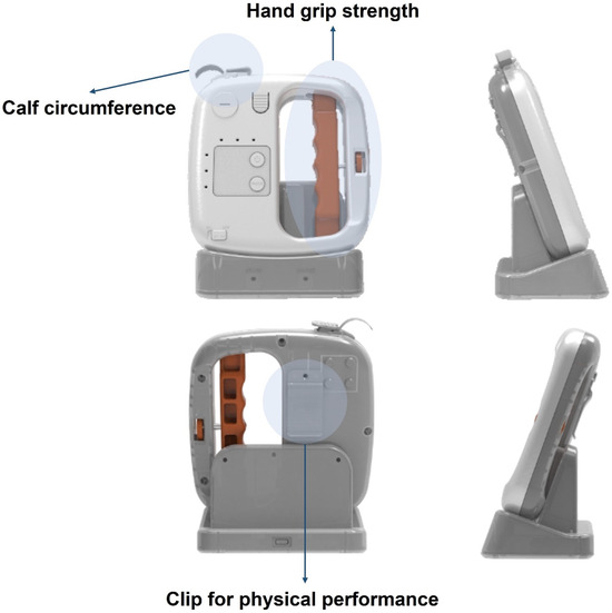 Photographs of Allgeun, including front, rear, left, and right views. In the front view, the arrows indicate calf circumference and handgrip strength, both essential for diagnosing sarcopenia. In contrast, in the rearview, the arrow indicates the clip used to measure physical performance, which is necessary for assessing the severity of sarcopenia. The device is designed to be portable and user-friendly, facilitating its straightforward utilization in primary care settings.