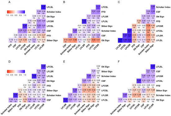 The results of the correlation between FTs and spinal ROM tests based on departments. Legend. (A): Information Technology students; (B): Literature students; (C): Management students; (D): Engineering students; (E): Physical Therapy students; (F): Physical Education students; FFD: Finger-to-floor distance; LFLSL: Lateral flexion lumbar spine left; LFLSR: Lateral flexion lumbar spine right; LFCSL: Lateral flexion cervical spine left; LFCSR: Lateral flexion cervical spine right; CSF: Cervical spinal flexion; ns = p ≥ 0.05; * = p < 0.05; ** = p < 0.01; *** = p < 0.001. The correlation matrix uses color gradients to represent the correlation between dependent variables. The negative correlation of red or near-red color tones, the positive correlation of blue or near-blue hues, and color tones close to white and white indicate a neutral correlation. While the correlation value is displayed in the boxes, the statistical significance of this value is indicated below the value.