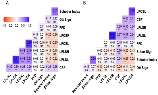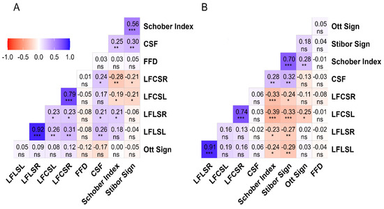 The results of the correlation between FTs and spinal ROM tests based on sex. Legend. (A): Male; (B): Female; FFD: Finger-to-floor distance; LFLSL: Lateral flexion lumbar spine left; LFLSR: Lateral flexion lumbar spine right; LFCSL: Lateral flexion cervical spine left; LFCSR: Lateral flexion cervical spine right; CSF: Cervical spinal flexion; ns = p ≥ 0.05; * = p < 0.05; ** = p < 0.01; *** = p < 0.001. The correlation matrix uses color gradients to represent the correlation between dependent variables. The negative correlation of red or near-red color tones, the positive correlation of blue or near-blue hues, and color tones close to white and white indicate a neutral correlation. While the correlation value is displayed in the boxes, the statistical significance of this value is indicated below the value.