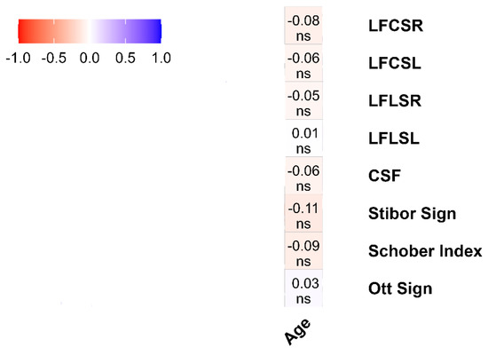 The results of the correlation between FTs and spinal ROM tests based on age. Legend. LFLSL: Lateral flexion lumbar spine left; LFLSR: Lateral flexion lumbar spine right; LFCSL: Lateral flexion cervical spine left; LFCSR: Lateral flexion cervical spine right; CSF: Cervical spinal flexion; ns = p ≥ 0.05. The correlation matrix uses color gradients to represent the correlation between dependent variables. The negative correlation of red or near-red color tones, the positive correlation of blue or near-blue hues, and color tones close to white and white indicate a neutral correlation. While the correlation value is displayed in the boxes, the statistical significance of this value is indicated below the value.
