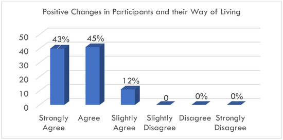 Participants were asked to rate the effectiveness of each lesson in the Eight Steps to Great Compassion program on a five-point response scale (1 = very ineffective, 5 = very effective). The overall mean effectiveness rating was 4.44. When rating the impact of the compassion education training program on their personal change, 88% of participants either agreed or strongly agreed that completing the lessons led to positive changes in themselves and in the way that they live, as shown in Figure 1. The remaining 12% of participants also agreed, albeit slightly, with the positive impact of the lessons (Figure 2).