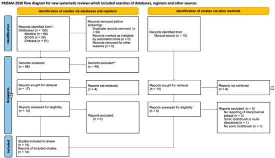 Seventeen studies were eligible for full-text review; however, four were not retrievable. The remaining 13 studies were retrieved, fully assessed and included. From the manual search, 6 out of 10 were available for the full-text assessment, of which all but 1 [29] were excluded, due to a lack of reporting on the interproximal plaque level (3/6), to the sonic toothbrush being multi-directional (1/6) or to the lack of a sonic toothbrush control group in the study (1/6). Fourteen studies were included at the end of the selection process.