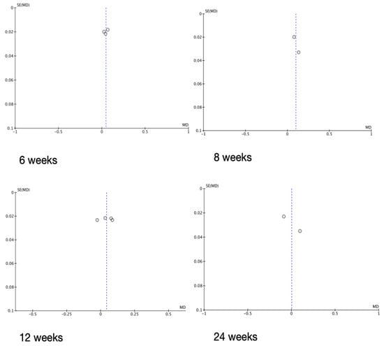 The included studies were categorised into different groups according to the follow-up interval with the aim of making them comparable for the quantitative meta-analysis. Four groups were available for the analysis at 6, 8, 12 and 24 weeks.
