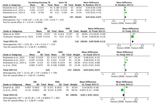 Appropriate studies were grouped by follow-up time. As can be seen from the forest plots (Figure 3), the results were found to be in favour of the oscillating–rotating toothbrush in most of the studies.