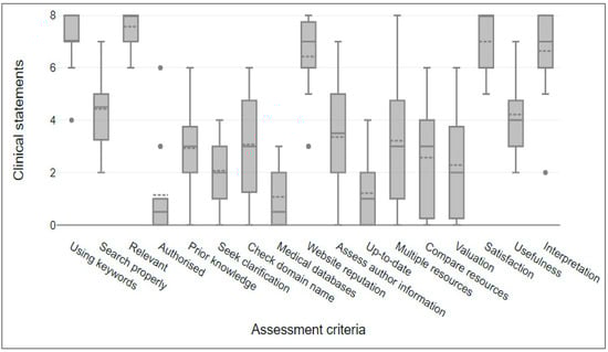 An overall ranking was performed based on 17 questions with yes or no answers (Table 2). Table 3 presents an example of using the tool to record the performance of an NIS to obtain EBHI for clinical statement number one, to illustrate part of the performance score. This tool can be used to explore the relationship between performance and other independent variables, such as information quality assessment and clinical statement level, to further analyze information-seeking skills. These relationships were analyzed using SPSS to extract the median, minimum, and maximum values, as well as to create a boxplot. The median is a measure of central tendency, which is used instead of the mean if the normality of the data distribution is not known (hard to verify in this study with only fourteen participants) [48]; the median identifies the typical and outlying responses in a data set. Due to the distribution of multiple datasets, boxplots were used to present the data graphically. They were useful for identifying similarities and differences between datasets.