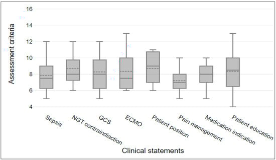 The clinical statements (CSs) were about different subjects, such as medical diagnosis, contraindications, nursing routine care, guidelines, pain management, nursing responsibility, and patient education. Each NIS was recorded and assessed in relation to eight clinical statements (thus, each clinical statement level might score from 0 to 17 for each participant). The data collected reveal that all clinical statements scored ranged from 4 to 13. Table 5 shows the clinical statement scores in order to show the level of engagement. The statistical analysis of the clinical statement level was pulled from the assessment criteria tool. The median score was slightly lower at 8; clinical statements scores ranged between 7 and 9.