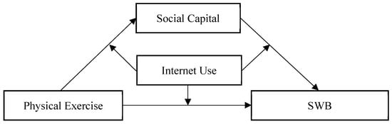 Theoretical model depicting the relationships among physical exercise, social capital, internet use, and SWB.