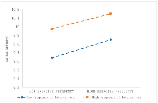 This study also conducted a simple slope analysis to illustrate the moderating effect of Internet use, as depicted in Figure 2 and Figure 3. Figure 2 shows that the social networks of residents who frequently use the Internet are larger than those of residents who use the Internet less frequently, regardless of whether their physical exercise frequency is high or low. For respondents with a lower frequency of Internet use (W − 1SD), physical exercise significantly and positively predicts social networks (simple slope = 0.085, t = 4.998, p < 0.001); however, for individuals with a higher frequency of Internet use (W + 1SD), the impact of physical exercise on social networks is not statistically significant (simple slope = 0.023, t = 1.322, p = 0.186). This result suggests that Internet use acts as a moderator in the relationship between physical exercise and social networks. Specifically, as the frequency of Internet use increases, the impact of physical exercise on social networks decreases.