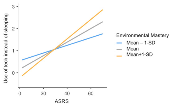 Finally, a significant moderation effect (F(1,432) = 5.28, p = 0.02) of PWB Environmental Mastery dimension was found in the relationship between ASRS total score and mean hours spent using technological devices instead of sleeping. Specifically, at higher levels of PWB Environmental Mastery, the effect of ADHD symptomatology on the mean hours spent using technological devices instead of sleeping was stronger; in other words, higher ADHD symptoms severity increased the time spent using technological devices instead of sleeping, and this increase was stronger when the levels of PWB Environmental Mastery were higher (Figure 2).