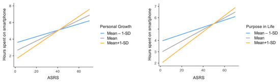 Significant PWB Personal Growth and Purpose in Life dimensions significantly moderated the relationship between ASRS total score and hours spent using smartphones. Indeed, the interaction between PWB Personal Growth and ASRS total score was statistically significant (F(1,431) = 5.56, p = 0.01) as well as that between PWB Purpose in Life and ASRS total score (F(1,431) = 4.04, p = 0.04). Specifically, at higher levels of PWB Personal Growth and Purpose in Life, the effect of ADHD symptomatology on hours spent using smartphones was stronger; in other words, higher ADHD symptoms severity increased the time spent using smartphones, and this increase was stronger when the levels of PWB Personal Growth and Purpose in Life were higher (Figure 3).