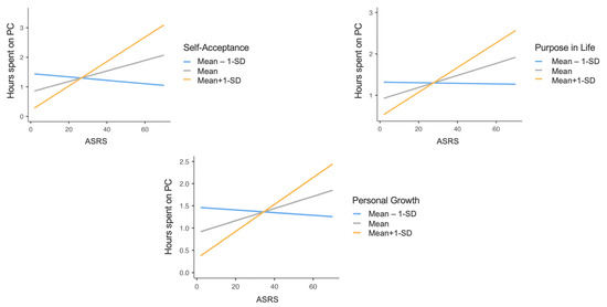 Furthermore, significant interaction effects of PWB dimensions of Self-acceptance (F(1,433) = 10.64, p = 0.01), Personal Growth (F(1,433) = 5.59, p = 0.01), and Purpose in Life (F(1,433) = 4.86, p = 0.02) were found in the relationship between ASRS total score and hours spent using PCs. Specifically, at higher levels of PWB Self-acceptance, Personal Growth, and Purpose in Life, the positive effect of ADHD symptomatology on time spent using PCs was stronger; in other words, higher ADHD symptoms severity increased time spent on PCs, and this increase was stronger when the levels of PWB dimensions were higher (Figure 4).