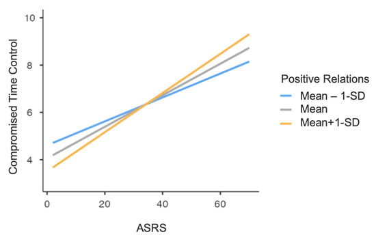 Finally, a significant moderation effect of PWB Positive Relations was found in the association between ADHD symptomatology and the CTC dimension of the IAT (F(1,439) = 4.14, p = 0.04). Specifically, at a higher level of PWB Positive Relations, the effect of ADHD symptoms on time control related to Internet use was higher; in other words, higher ADHD symptoms severity increased IAT Compromised Time Control level, and this effect was stronger when PWB Positive Relations scores were higher (Figure 5).