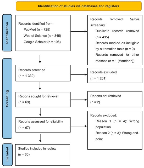 Two articles could not be retrieved in full versions. After reviewing the 67 remaining articles, a further 7 articles were excluded, given that healthcare professionals were the target population, or the primary outcomes “knowledge” and “perception of palliative care” were not analyzed. All results were unanimous among the researchers (see Supplementary Materials). In the end, 60 articles were included in the systematic review. The PRISMA flowchart summarizes the process (see Figure 1).