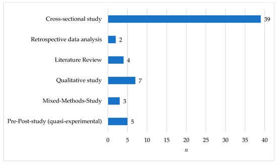 Cross-sectional studies made up the largest portion (n = 39, 65.0%) of the articles. The literature reviews included one systematic review, two scoping reviews and one integrative review. Furthermore, one congress paper, one dissertation and one master’s thesis were included. No randomized controlled trials were found to answer the research question. Figure 2 summarizes the included types of studies.