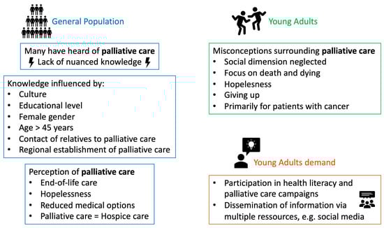 More than half of the respondents who were able to develop a concept of palliative care for themselves felt that this concept was not clear and should be refined [80]. They were not aware of the holistic approach of palliative care and, compared with older populations, were more likely to think that palliative care does not address the care of relatives and friends [57]. Knowledge of palliative care in this age group is strongly influenced by whether relatives have already had contact with palliative care structures [24,50].