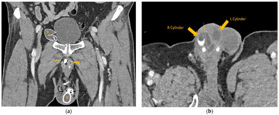 - Chorney, E.T.; Ramchandani, P.; Jaffe, W.I.; Siegelman, E.S. CT and MR imaging features of artificial urinary sphincters, penile prostheses, and other devices in the male lower genitourinary tract. Radiographics 2018, 38, 794–805. [Google Scholar] [CrossRef] [PubMed]