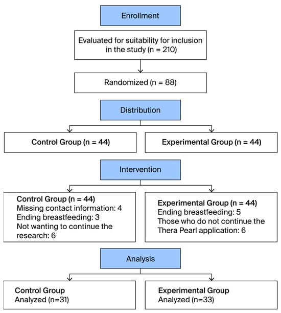 The total number of people evaluated for suitability for the study was 210. A total of 86 individuals did not meet the inclusion criteria, and 36 refused to participate. Randomization was performed with 88 people, and each group consisted of 44 people. The groups were informed about the research, and the experimental group was given intervention material. During data collection, 11 people from the experimental group were excluded (5 people who stopped breastfeeding completely and 6 people who did not want to apply the Thera Pearl). In the control group, 13 people were excluded (4 people with missing contact information, 3 people who stopped breastfeeding completely, and 6 people who did not want to continue the research). As a result, this study was completed with 64 mothers (33 experimental and 31 control). In addition, after the completion of the data-collection phase, post hoc power analysis was performed with the G-Power Data Analysis program (GPower 3.1). When the power analysis was calculated by taking a 95% confidence interval, p = 0.05 significance level, and sample size of 64, the power of the study was determined to be 95%, and it was concluded that the sample had good power to represent the population.