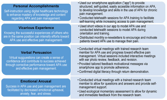 Emotional Arousal. The last source of information from which self-efficacy is derived is emotional arousal. Individuals experience stress and anxiety in threatening situations, which impacts their self-efficacy, resulting in suboptimal performance, fear, and failure [6]. On the other hand, modifying self-limiting emotions through attribution, relaxation, biofeedback, or cognitive processing can reduce self-doubt, improve performance, and increase self-confidence. In our studies, we used virtual meetings to provide opportunities to answer participant questions and deliver self-management support by trained research team members. We also employed ecological momentary assessment (EMA) [8,31] to provide immediate feedback from the research team to the study participants. EMA is a method used to collect real-time data, as participants go about their daily activities, through short surveys delivered via smartphones. We employed EMA in our prior studies to allow for the real-time assessment of participants’ pain levels and their APA usage. Participants were instructed to click on a link that was texted to them at four random times during the day to evaluate their pain levels and APA use. These data were processed and visually displayed as graphic images in each participant’s app, allowing the participants to see and monitor their pain levels and APA performance data. According to Bandura [5,6], when individuals see their efforts and successes, these motivate them toward the further mastery of tasks, producing a greater sense of accomplishment and positive emotional arousal for enhanced competence. We then advised participants to continue their APA use for 4 weeks. We anticipated that some participants might struggle and experience setbacks in their APA use. Our EMA data allowed the research team to monitor participants’ progress and facilitate dynamic and immediate feedback. Further, our virtual meetings helped to assist and encourage behavior and actions toward independent performance to produce successful experiences that helped to reinforce their competency in APA.