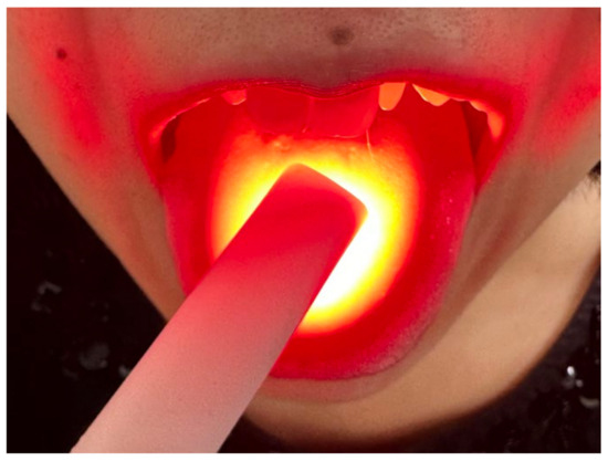 PDT was performed using a laser-activated disinfection device (FotoSan630, CMS Dental Inc., Roslev, Denmark) with red laser emission (wavelength: 630 nm, irradiance: 2000–4000 mW/cm2, spot size at the probe tip: diameter of 8 mm). High-viscosity methylene blue gel (0.1 mg/mL) (FotoSan Agent, CMS Dental Inc.) was applied at 1 cm intervals for a total of six spots on the center left, the center midline, the center right, the posterior left, the posterior midline, and the posterior right side of the tongue dorsum. Then, each spot was irradiated for 30 s. During the laser irradiation, the participants and operator wore goggles to protect their eyes from the laser. After PDT, the methylene blue gel was completely washed away with sterile purified water.