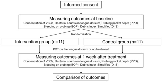 The concentration of VSCs, bacterial counts on the tongue dorsum, probing pocket depth (PPD), bleeding on probing (BOP), and simplified oral debris index (DI-S) score were determined before and 1 week after PDT (Figure 1). Each measurement was performed at the same time in the morning (between 7 and 9 AM).
