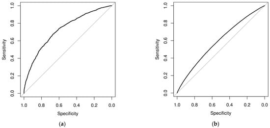 Figure 1 panel (a) shows the ROC curve for the multivariate model of the coding specificity of a principal diagnosis related to dementia. The estimated AUC was 0.7269, representing the good reliability of the multivariate model in assessing the coding specificity of dementia-related principal diagnoses. Panel (b) shows the ROC curve corresponding to the multivariate logistic regression analysis for assessing the coding specificity of secondary dementia diagnoses. The corresponding AUC was 0.5919, demonstrating a worse model performance when compared to that of the model assessing the coding specificity of primary dementia diagnoses.