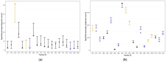 Observed counts of indicators of principal diagnosis coding specificity (a) and secondary diagnosis coding specificity (b) for dementia diagnoses by facility (dots) and 95% confidence intervals based on the Poisson binomial metric (error bars), with colors denoting over-specificity (orange), under-specificity (blue), and specificity in line with peers (black).