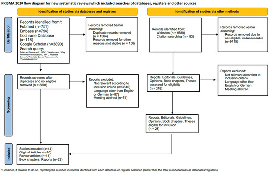 Due to the relatively low mortality rate of PC, patients are at a higher risk of experiencing significant functional and psychological impairments resulting from treatment side effects. Consequently, functional outcomes, such as urinary continence and erectile function, have become more important to patients and measurements of those metrics have become a surrogate of treatment quality. To address these specific needs of PC care, an additional perspective called the ‘PC-Specific Disease and Outcome Perspective’ was implemented. This perspective includes case mix variables defined by the ICHOM, as well as patient-related outcomes (PROMs) and postoperative complications derived from the variables of the certification process of the DKG [19,20,24,25]. The KPIs were identified through a systematic literature search following the guidelines of the Cochrane Collaboration and Preferred Reporting Items for Systematic Reviews and Meta-Analyses (PRISMA) [26]. A systematic literature search was conducted using the databases PubMed, EMBASE, Cochrane Library CENTRAL, Google Scholar and Scopus for articles published prior to 21 December 2021. This search was not registered according to the PRISMA statement, nor was a protocol prepared. The bibliographies of the retrieved articles were also searched for relevant studies that were not included in the database search. Case reports and conference abstracts were excluded. In addition, we performed a literature search using Google including non-indexed reports. The search query included the items ‘Balanced Scorecard’, ‘BSC’, ‘health care’, ‘Key Performance Indicators’, ‘KPI’, ‘Prostate Cancer’, ‘Prostate Cancer Assessment’, and the German item ‘Prostatakarzinom’. Initial screening by article title and abstract was performed by one investigator to identify eligible studies. Potentially relevant studies were subjected to a full-text review. Manual searches of reference lists of relevant articles were also carried out to find additional studies of interest. The process is given in Figure 1 and the PRISMA checklists (Supplementary Materials Files S1 and S2).