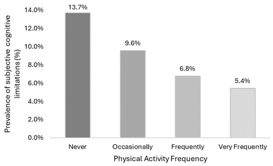 Chicago/Turabian StyleDenche-Zamorano, Ángel, Diana Salas-Gómez, Juan Manuel Franco-García, José Carmelo Adsuar, José A. Parraca, and Daniel Collado-Mateo. 2024. "Associations between Physical Activity Frequency in Leisure Time and Subjective Cognitive Limitations in Middle-Aged Spanish Adults: A Cross-Sectional Study" Healthcare 12, no. 11: 1056. https://doi.org/10.3390/healthcare12111056