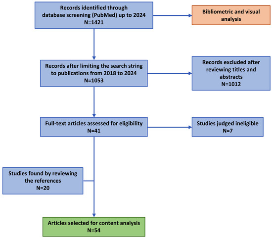 To assess the evolution and current state of research in the field of DHTs, we conducted a bibliometric and visual analysis of all retrieved articles to identify key trends, patterns, and interrelationships. The data required for the bibliometric analysis were obtained from the NCBI Entrez API, which allows a computer program to replicate bibliographic searches in PubMed. This process yields a dataset containing structured metadata extracted from the retrieved articles. The following bibliometric indicators were extracted from each paper and imported for in-depth analyses: publication year, journal name, journal country, abstract, and keywords. Finally, impact factors, quartiles, and journal categories were obtained from the Journal Citation Reports (Clarivate).