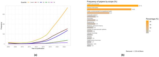 Results of the bibliometric analysis showing (a) the evolution of published papers indexed in PubMed by quartile and (b) the frequency of papers by scope.