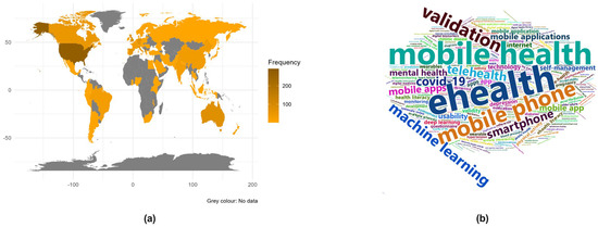 To identify key themes and topics prevalent in the literature, we conducted a word cloud technique to obtain a visual representation where words are sized according to their frequency of occurrence in the text. From this analysis, we observed that terms such as “eHealth”, “mobile health”, “mobile phone”, and “validation” emerged as the more prominent keywords (Figure 3b).