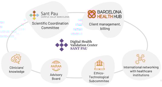 Firstly, the Digital Health Validation Center’s differential factor relies in its internal structure and network of stakeholders, including an innovation hub (BHH), public health sector, and industrial innovation sector. The internal structure, the Scientific Coordinating Committee, is composed of healthcare professionals, bioengineers and telecommunication engineers, information system (IT) experts, epidemiologists, statisticians, medical writers, study coordinators, experts on ethics, legal and regulatory issues, patient advocates, or diffusion and brand experts, among other relevant roles. This structure is complemented by an advisory committee, including several experts in the fields of technology transfer, research or strategy (https://ehealthvalidationcenter.santpau.cat/en/web/public/qui-som (accessed on 10 May 2024)). This collaborative effort expedites contractual and regulation aspects of clinical validation design and execution, ensuring efficient design and execution while guaranteeing the allocation of necessary resources for successful implementation.