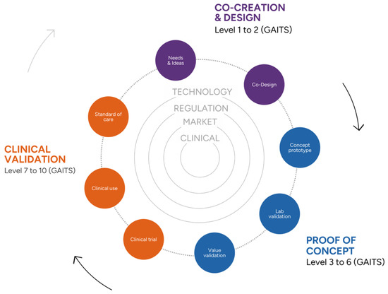 Secondly, it ensures that all relevant aspects of health technologies are covered. Based on the existing international framework Guidance and Impact Tracking System (GAITS), an initial assessment of the maturity of a given DHTs is performed to tailor services (Figure 5). This assessment guides the tailoring of services, encompassing co-creation and design for initial stages of maturity; proof-of-concept of DHT for initial tastes, often related to viability, usability or acceptability; and clinical validation through clinical trials including a larger number of participants and specific clinical endpoints.