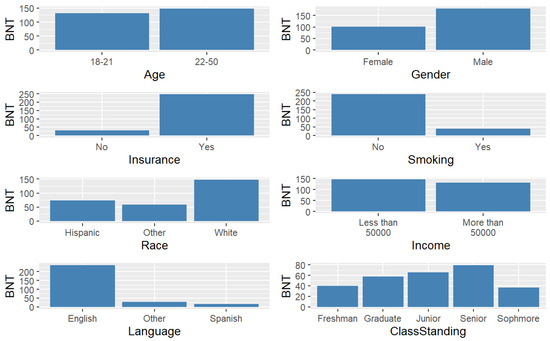 For the first hypothesis, several studies have found associations with age, race, gender, income, educational level, and health insurance [17,18,22,23]. For example, Yamashita et al. (2020) explored health insurance, age, sex, race/ethnicity, education, and numeracy levels as predictors of healthcare utilization. Cavanaugh et al. (2008) [17] determined that older, nonwhite, diabetics with low income and lower education levels had lower numeracy levels. The related literature considered smoking status [29] and primary language [30] as predictors of health literacy among college students. To our knowledge, there is no literature that considered college or class standing as a factor of risk literacy, so we considered studies in related fields. Thus, for the second and third hypotheses, we conjecture that BNT scores vary with college classification and student classification based on the related health literacy literature [31,32].