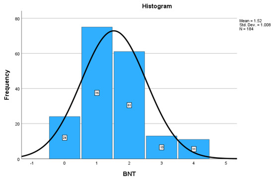 Data were analyzed with IBM Corp. SPSS Statistics Version 28 [34] and with R statistical software 2023 [33]. There was no missing data for the dataset (n = 184). The BNT test was scored with Qualtrics 2024 software. All levels of the BNT Score (zero to four) were represented in the independent variables. Relationships between the BNT scores and the independent variables were analyzed at the alpha significance level of 0.05 (p ≤ 0.05).