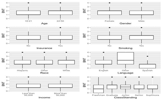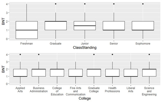 Figure 5 and Figure 6 display the BNT Scores by independent variable with grouped boxplots where black dots indicate potential outliers. First, we examined the grouped box plots for the BNT score and each independent variable. Overall, the highest BNT score (4) was present in most of the independent variables for all levels, except Insurance = ‘No’, freshman class standing, and some colleges. The median BNT score was higher for ages 22–50 when compared to the 18–21 group.