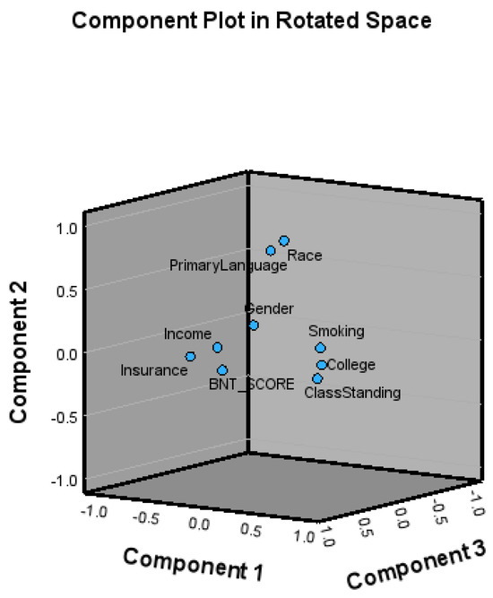 Figure 7 presents a three-dimensional plot of the proximity of the variables, based on 47.15% of the total variations. There is a closer proximity for income and insurance to the primary variable which is the BNT score. Gender is close to the BNT score. Race and primary language are close to each other. Class standing is close to college as expected.