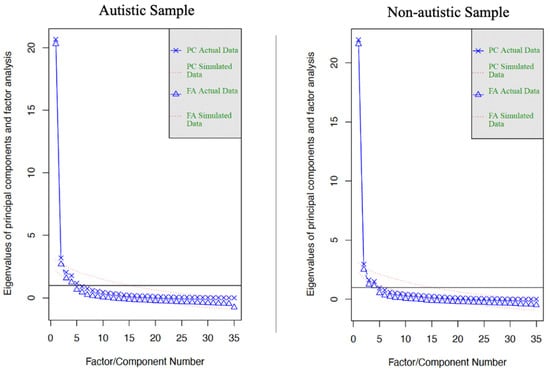 All quantitative data analysis was performed in R version 4.3.2 (31 October 2023). After analyzing the qualitative data, we conducted a factor analysis with the aim of identifying the factor structure of our initial set of items based on our samples. We randomly divided each sample into two groups, one for the exploratory factor analyses (EFAs) and one for the follow-up preliminary confirmatory factor analysis (CFA) [31]. We utilized four groups: (1) 50 autistic participants for the EFA, (2) 50 non-autistic participants for the EFA, (3) 50 autistic participants for use in CFAs, and (4) 50 non-autistic participants for use in CFAs. We created these groups by using stratified random sampling (i.e., dividing the groups into autistic and not autistic and, then, randomly assigning each group to EFA and CFA). All models were conducted in lavaan [32]. We conducted two EFAs using lavaan, separately for each of the 50-participant groups. We utilized scree plots (Figure 1) to determine the number of factors most appropriate for both EFA groups.