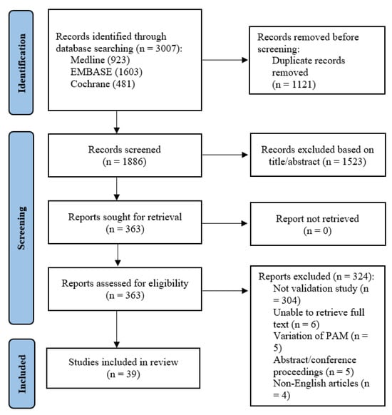 A total of 3007 abstracts were retrieved from the systematic search. After removal of duplicates, 1886 studies remained. After title and abstract screening, 363 articles remained and were sought for full-text review. Six full texts could not be retrieved despite best efforts and manual library search. Of the remaining 357 studies, 304 were not validation or reliability studies pertaining to the PAM, 5 used variations of the PAM e.g., caregiver-PAM, 5 were abstracts or conference proceedings, and 4 did not have English translation. A total of 39 manuscripts [,,,,,,,,,,,,,,,,,,,,,,,,,,,,,,,,,,,,,,] were finally included (Figure 1).