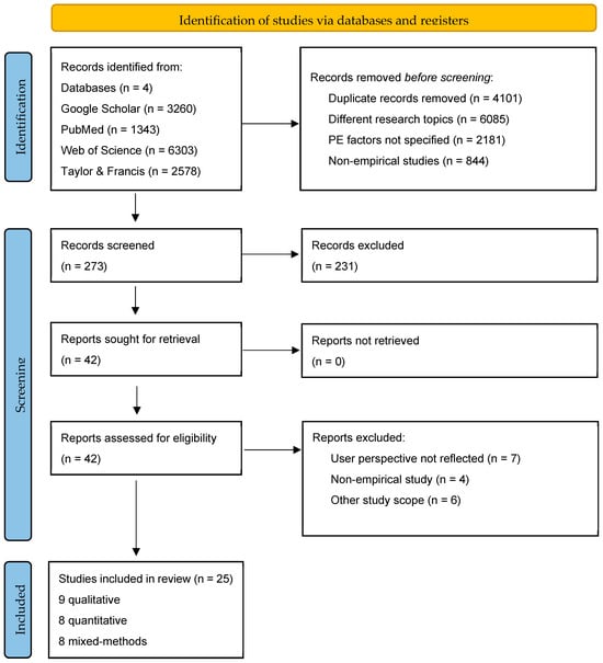 The initial search yielded 3260 papers from Google Scholar, 1343 from PubMed, 6303 from Web of Science, and 2578 from Taylor and Francis (total = 13,484 papers). After removing duplicates and papers for which no abstract was provided, 4101 records were excluded. Studies not related to improving PE in healthcare services or PE factors were not specifically mentioned, and non-empirical studies were excluded. Of the 273 remaining records, 231 were screened by title and abstract reviews. Subsequently, 42 studies were retrieved and assessed for eligibility. Papers that did not reflect the user’s perspective, were non-empirical, or had a research scope or target too specific to a specific field were also excluded. Finally, 25 studies were included in the review (9 qualitative, 8 quantitative, and 8 mixed-methods studies) (Figure 1).